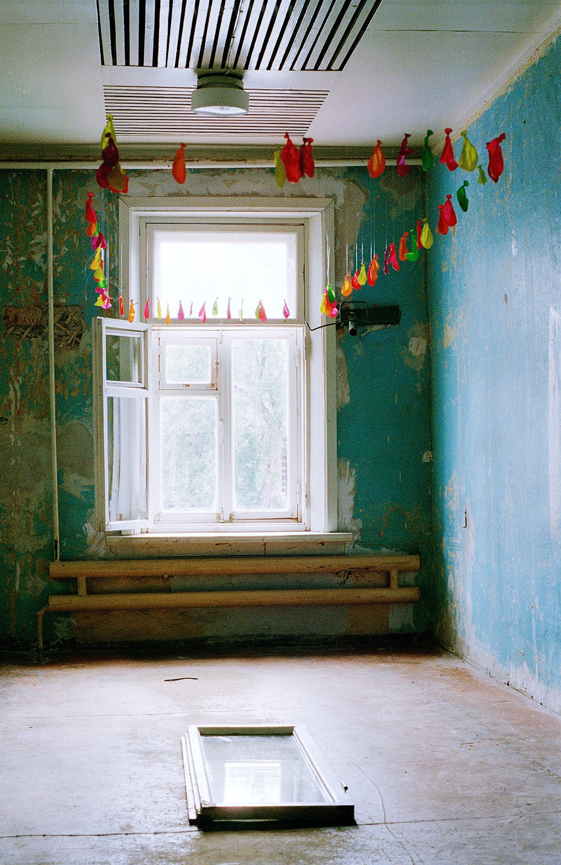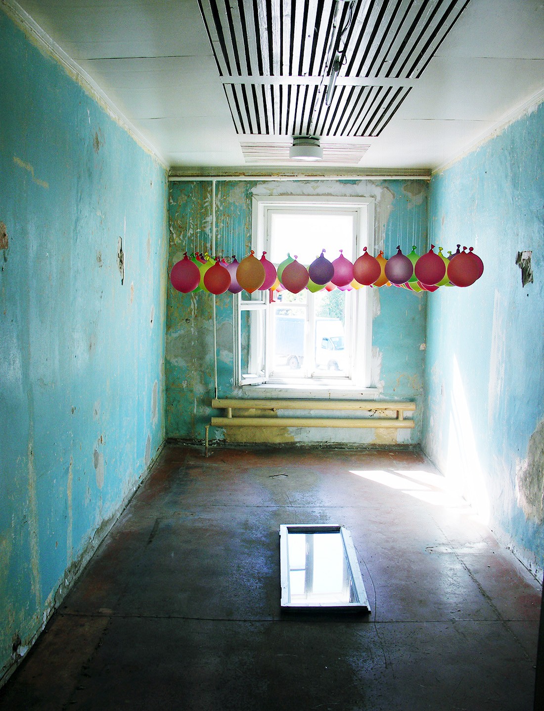 Room is mirrored by the rectangular-shaped hangings for balloons and also by the window lying in the middle of the installation.